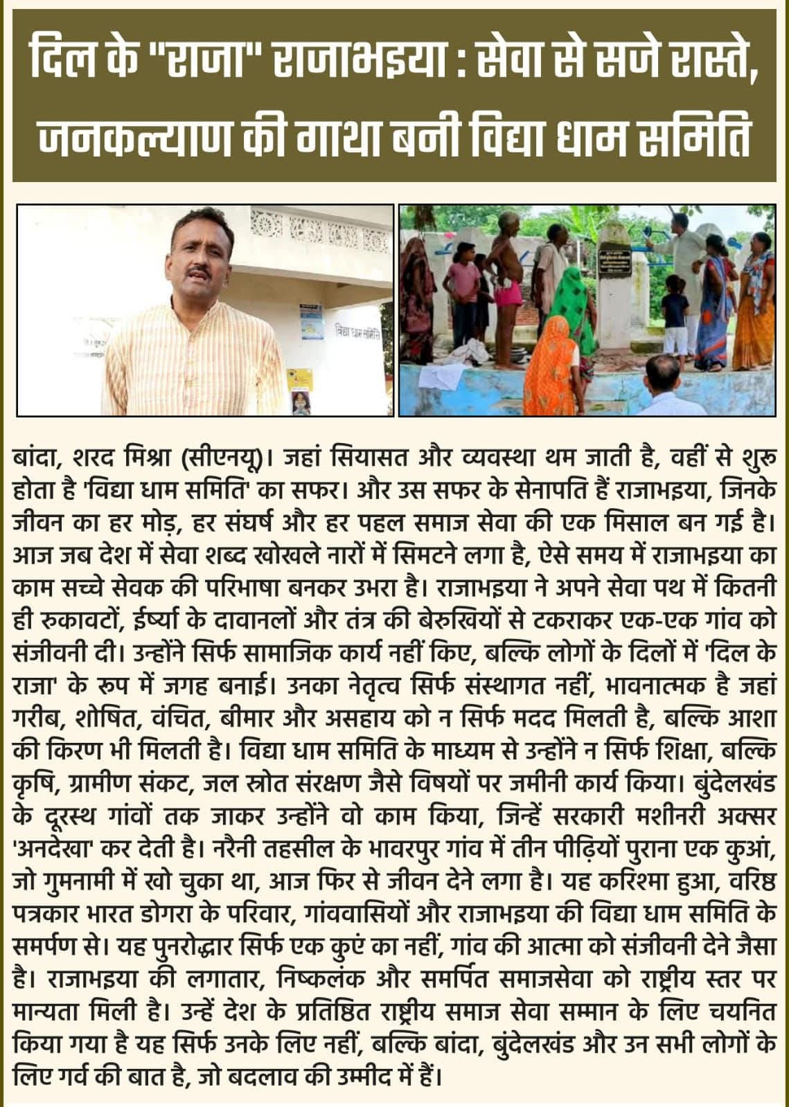 बाँदा मे एक दशक पूर्व से पहले दैनिक जागरण मे ज़िला संवाददाता रहे बुजुर्ग पत्रकार व शरदचन्द्र मिश्रा के पिताजी विनोद मिश्रा आज बेटे के साथ डिजीटल सिटी न्यूज़ उत्तरप्रदेश वेबसाइट चलाते है। हिन्दी शब्दों की वर्तनी से खेलने मे खिलाड़ी विनोद मिश्रा टारगेट बेस्ड/ लक्ष्यभेदी पत्रकारिता अक्सर करतें है। उन्हें अतर्रा कस्बा की विद्याधाम समिति एवं राजाभैया की चिंगारी से भी बेहद लगाव है। उन्ही की कतार मे बाँदा के कुछ अन्य इलेक्ट्रॉनिक व प्रिंट पत्रकारिता वाले लाल बादशाह जिन्होंने राजाभैया यादव को अपनी स्नेहशीलता का आशीर्वाद कुछ उद्देश्य की पूर्ति हेतु दे रखा है। वे राजाभैया की सामाजिक चालबाजी, एनजीओ पब्लिक स्टंट, उनकी व्यक्तिगत आपराधिक संगठनात्मक चक्रव्यूह रचना और दोयम जनसेवा की निर्लज्ज कथा से बखूबी परिचित भी है परंतु हर दुर्व्यसनों को ताक पर रखकर अंधभक्ति की पराकाष्ठा के सूरवीर उन्हें समाजसेवा का राजाभैया लिखकर महिमामंडन करते नही थकते है। गत पंद्रह वर्षों से यह सिलसिला सिर्फ इसलिए जारी है ताकि चंद उद्देश्य व मान-सम्मान बचा रहे जो असलियत मे खोखले आभामंडल पर तेजस्वी सूर्य मे लगने वाले काले ग्रहण जैसा प्रतीत होता है। अलबत्ता वे ऐसा करते है, आगे भी करेंगे जैसे ज़िला पंचायत अध्यक्ष सुनील पटेल आज उनके लिए ग्रास / अवसर का निवाला है वैसे राजाभैया भी परोक्ष लाभार्जन का सूत्रपात है। सूचना संसार तस्वीरों से इसका संकेत करता है बाकी लिखी खबर का फोटो भी साक्ष्य के लिए चस्पा है। यह अखबारी खबर राजाभैया के जिला कारागार से छूटने के बाद तेलपानी को लिखी गई है। इस क्रम मे नगरपालिका परिषद से जुड़ी कई खबरों को अक्सर व्हाट्सएप ग्रुपों मे झेलना पड़ता है।