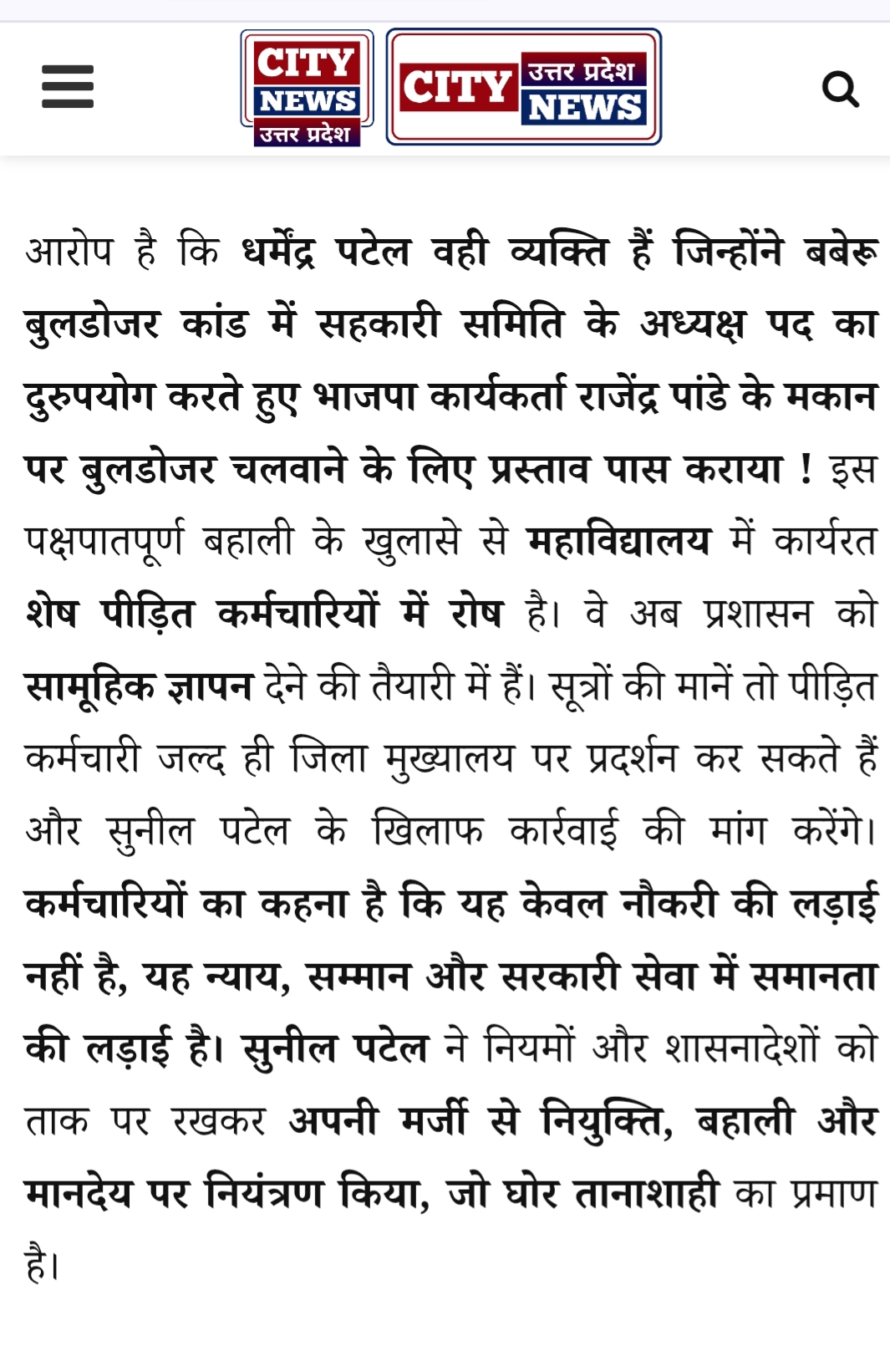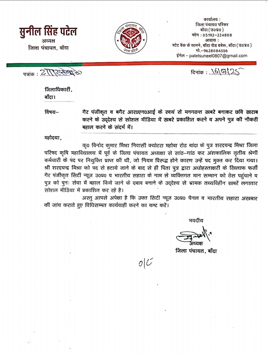 बाँदा ज़िला पंचायत अध्यक्ष सुनील पटेल ने अपने हस्ताक्षर युक्त शिकायत पत्र जिलाधिकारी बाँदा श्रीमती जे.रीभा को सिटी न्यूज़ व भारतीय सहारा अखबार पर कार्यवाही विषयक लिखा है। उन्होंने लेटरपेड पर स्पष्ट लिखा है कि जिला पंचायत अधीनस्थ कृषि महाविद्यालय मे पूर्व जिला पंचायत अध्यक्षा श्रीमती सरिता द्विवेदी के कार्यकाल मे 11 अंशकालिक तृतीय श्रेणी कमर्चारियों की नियुक्ति हुई थी। यह इससे भी स्पष्ट है कि इनके संदर्भित खबरें व नियुक्ति पत्र व्हाट्सएप पर वायरल है। इन्ही कर्मचारियों मे शरदचन्द्र मिश्रा पुत्र विनोद मिश्रा निवासी केनपथ, बाँदा लगातार उनकी राजनीतिक छवि खराब करने को सुनियोजित / प्लांटेड खबरें अपने वेबसाइट सिटी न्यूज़ उत्तरप्रदेश व अखबार भारतीय सहारा मे लिखते है। उन्होंने कहा कि सिटी न्यूज़ की वेबसाइट आरएनआई भी नही है बावजूद इसके दुराग्रह पूर्ण पत्रकारिता उनके खिलाफ की जा रही है।