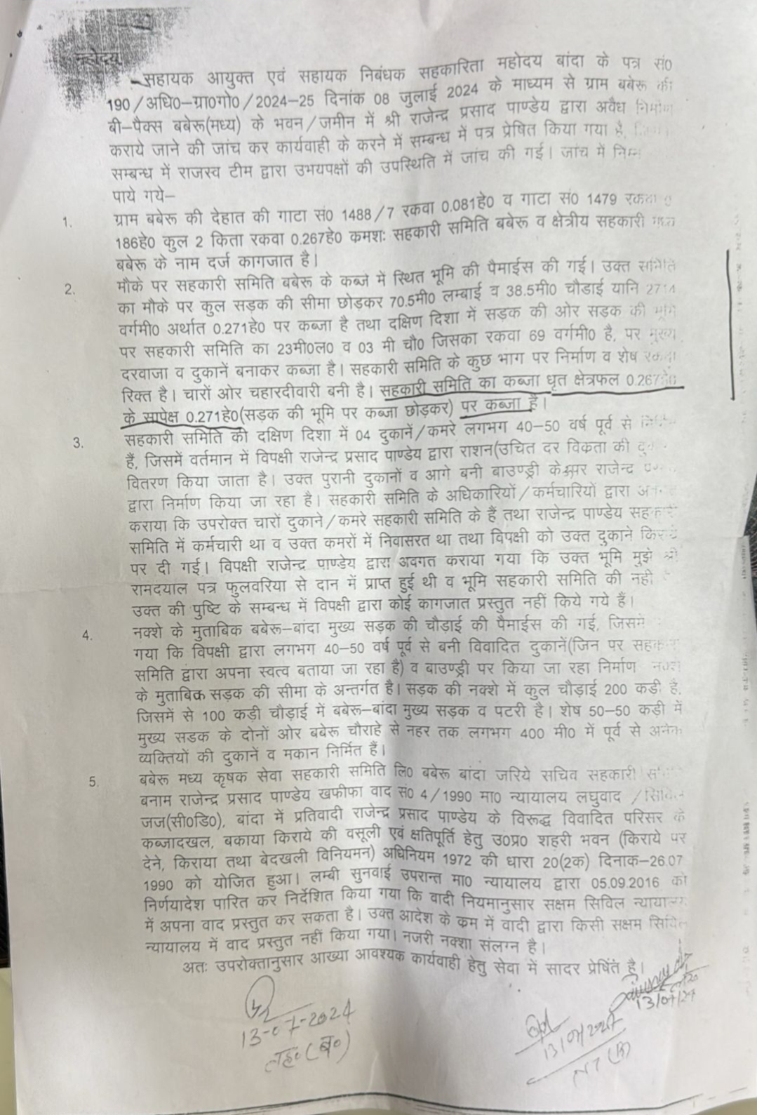लेकिन यहां सबसे बड़ा सवाल बबेरू एसडीएम की ही बीते 13 जुलाई 2024 पत्रांक 3037/आशु. की जांच आख्या विस्तृत रिपोर्ट पर उठता है जिसमें स्पष्ट लिखा है कि सहकारी का कब्जा धृत क्षेत्रफल 0.267 हेक्टेयर के सापेक्ष 0.271 हेक्टेयर (सड़क भूमि पर कब्जा छोड़कर) पर कब्जा है। इस रिपोर्ट का मूल रहस्य क्या एसडीएम रजत वर्मा जी बतलाने का कष्ट जनता को करेंगे ??