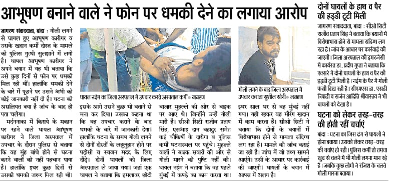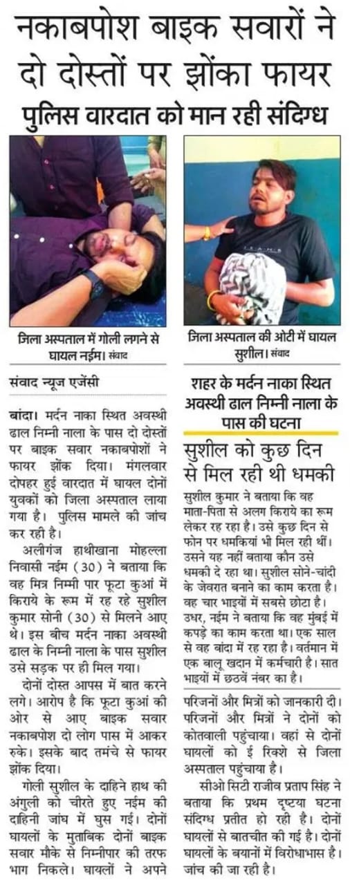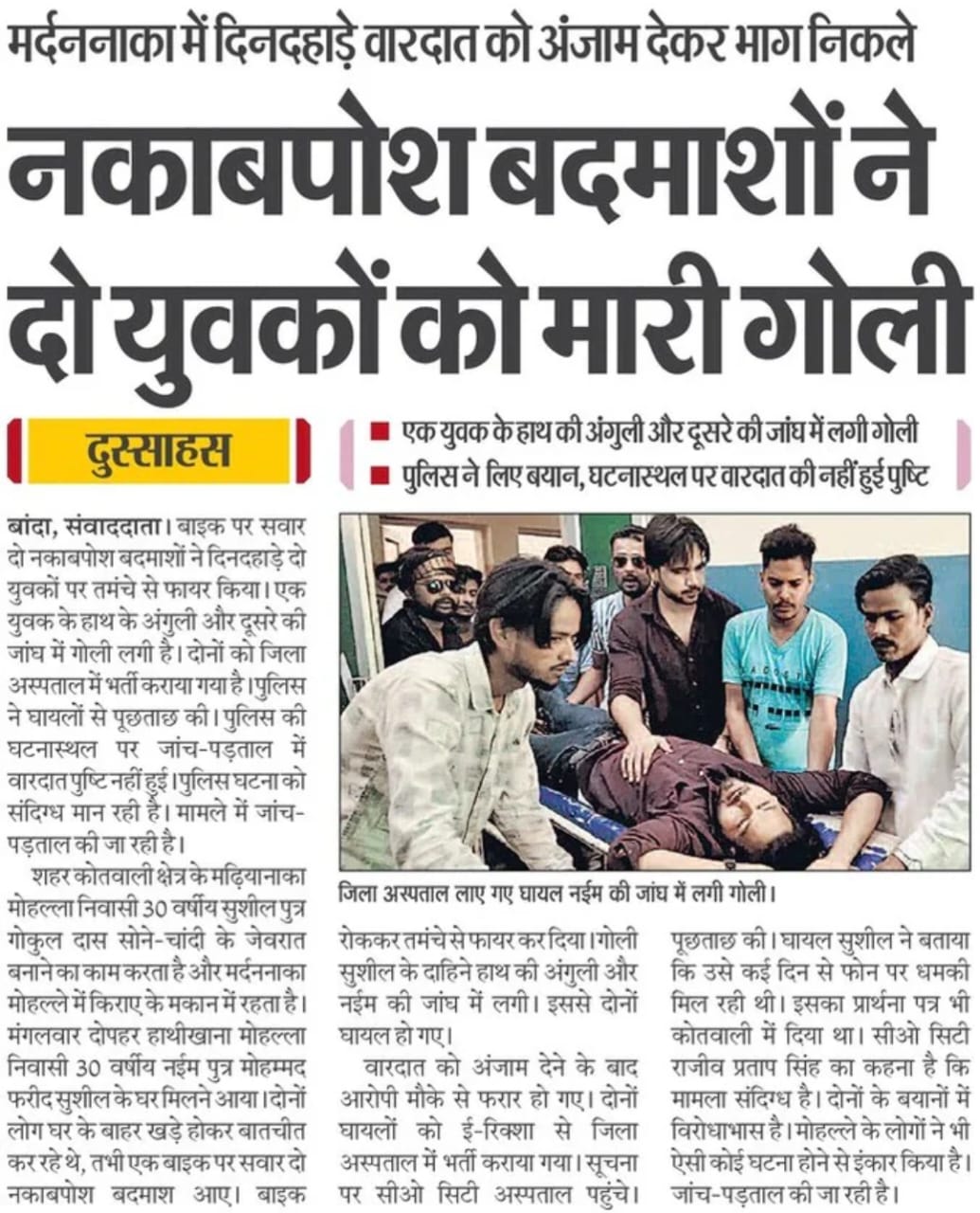 बाँदा। ज़िला मुख्यालय के शहर मर्दननाका क्षेत्र मे अलीगंज हाथी खाना निवासी नईम उम्र लगभग 30 वर्ष एवं उसके दोस्त फूटा कुआं, निम्नी नाला के पास किराए का कमरा लेकर रह रहे सुशील सोनी पर बीते मंगलवार गोली चली थी। दोनों घायलों को जिला अस्पताल मे भर्ती कराया गया। वहीं पुलिस टीम / सीओ सिटी ने स्वयं जांच स्थल पर पहुंच कर बयान लिए। उधर स्थानीय मीडिया ने इस मामले को सनसनी बनाकर ब्रेकिंग खबर की तर्ज पर चलाया। गौरतलब है कि पूरा घटनाक्रम दो दोस्तों पर कथित नकाबपोश हमलावरों के फायर झोंकने से जुड़ा है।