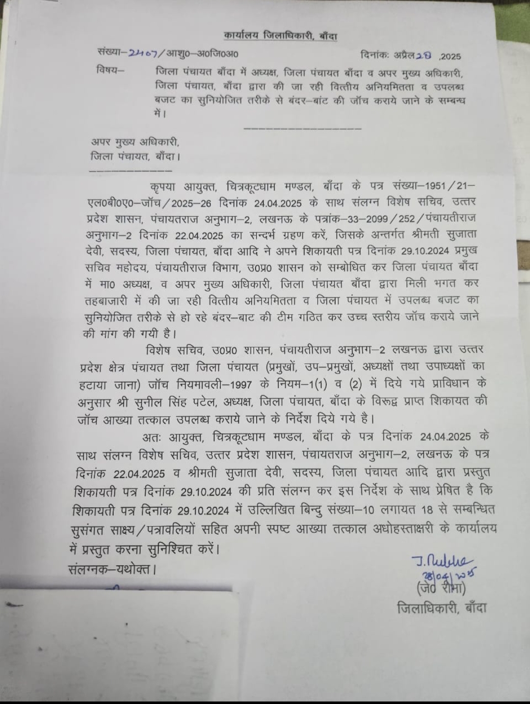 शिकायत कर्ताओं के पूर्व पत्रों एवं विशेष सचिव पंचायत राज अनुभाग 2 राजेश त्यागी के निर्देश पर चित्रकूट धाम मंडल आयुक्त अजीत कुमार ने बाँदा डीएम को दिनांक 24 अप्रैल 2025 को पत्रांक संख्या 1951/21-एलबीए-जांच/2025-26 दिनांक 24 अप्रैल का पत्र प्रेषित करके जांच आख्या तलब की है। वहीं मंडल आयुक्त के पत्र सन्दर्भ पर जिलाधिकारी श्रीमती जे.रीभा ने पत्रांक संख्या 2407/आशु.-अ.ज़ि.अ. दिनांक 28 अप्रैल को पत्र जारी किया है। उन्होंने एक सप्ताह मे अपर मुख्य अधिकारी व जिला पंचायत अध्यक्ष से आरोप व जांच विषयक उनका पक्ष / स्पष्टीकरण मांग लिया है।