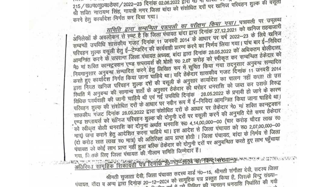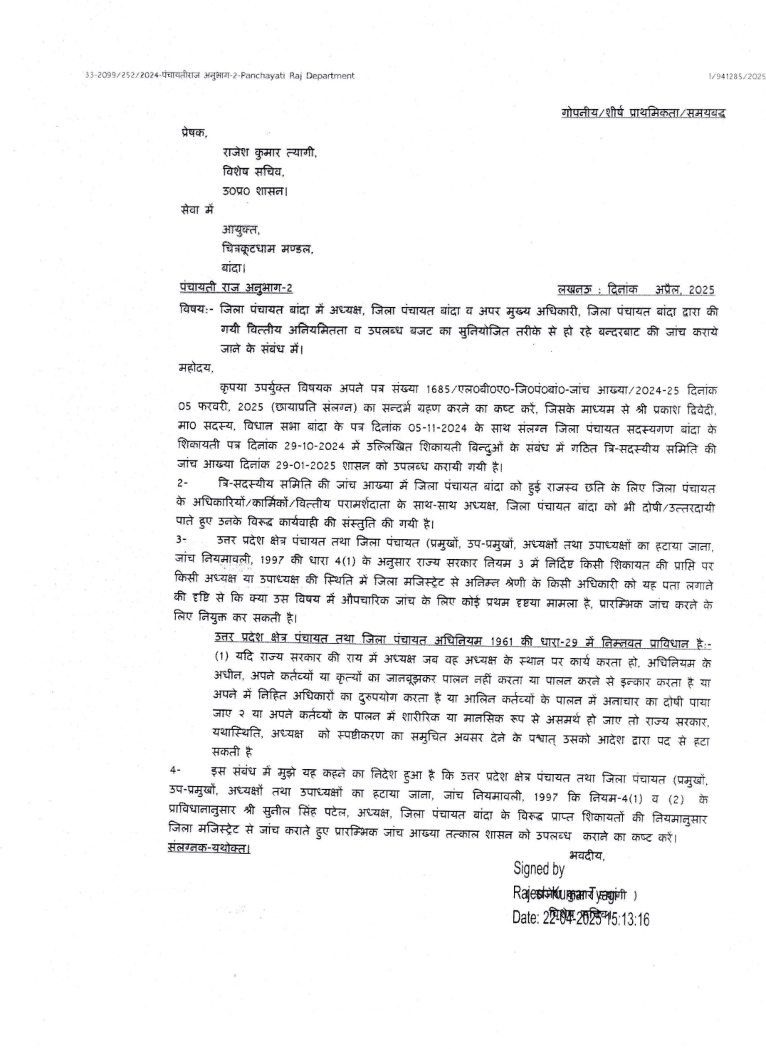बाँदा सदर विधानसभा 235 के विधायक प्रकाश द्विवेदी ने पत्रांक संख्या एमएलए/523 दिनांक 05.11.2024 एवं जिला पंचायत सदस्यों की शिकायत संदर्भ पत्र विशेष सचिव उत्तरप्रदेश शासन पंचायतराज अनुभाग-2 लखनऊ के पत्रांक संख्या 33-2099/252/पंचायतराज अनुभाग-2 दिनांक 22.04.25 के क्रम मे श्रीमती सुजाता देवी,मीरा देवी, सदाशिव अनुरागी आदि ने दिनांक 20.10.2024 को प्रमुख सचिव के समक्ष जरिये ज्ञापन शिकायत की थी। जिसमें बाँदा ज़िला पंचायत अध्यक्ष सुनील सिंह पटेल व तत्कालीन अपर मुख्य अधिकारी (एमए) पर वित्तीय भ्रष्टाचार के गम्भीर आरोप लगे थे।
