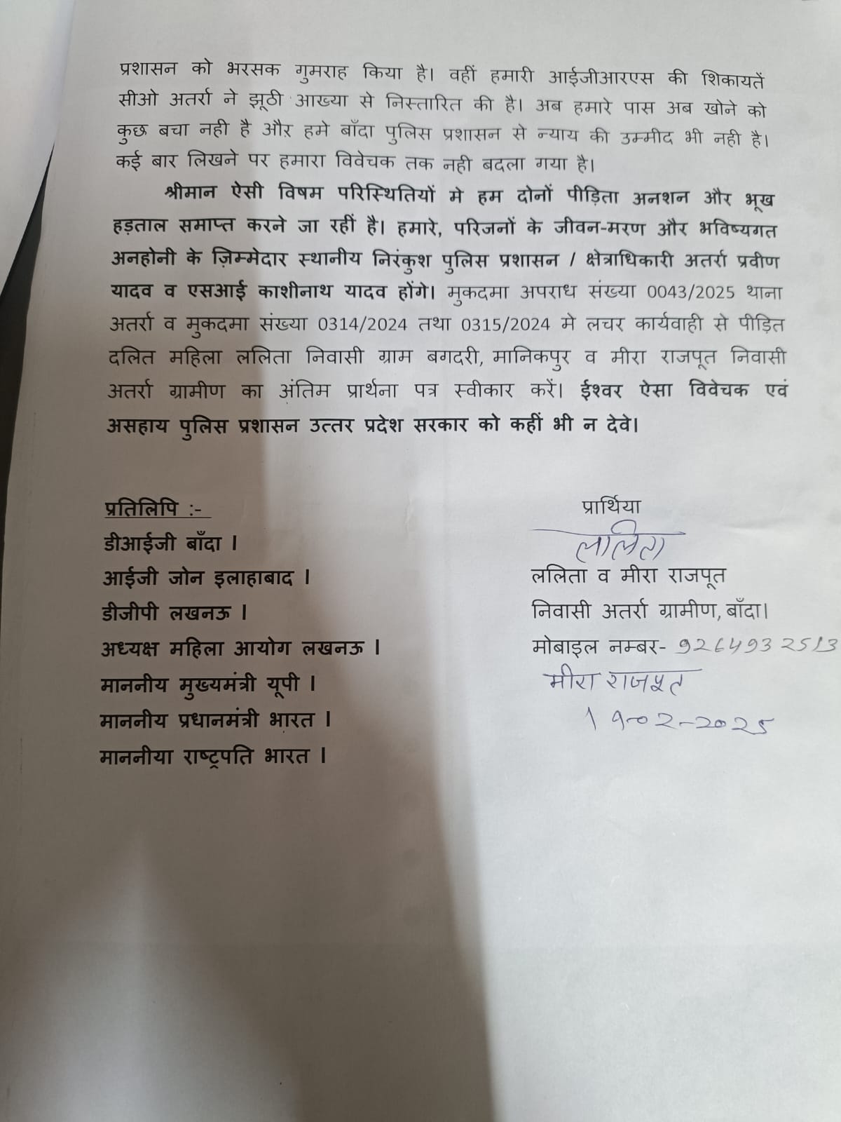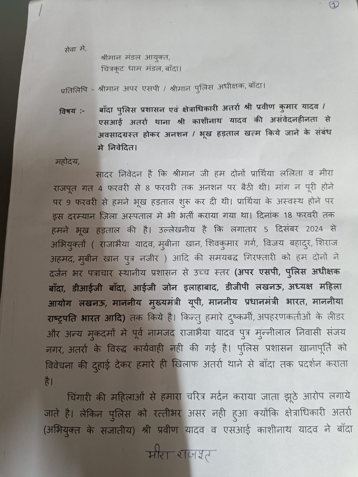 बाँदा के प्रमुख दैनिक अखबार अमर उजाला की खबर अनुसार इन दोनों महिलाओं ने 18 फरवरी को करुणा से भरा अपना अंतिम पत्र बाँदा पुलिस अधिकारी को दिया था। उन्होंने सिलसिले वार अपनी बात लिखी और अतर्रा आईओ पर पक्षपाती बर्ताव के आरोप लगाएं है। उन्होंने अभियुक्त राजाभैया यादव और सजातीय आईओ क्षेत्राधिकारी प्रवीण कुमार यादव- दलित महिला के विवेचक व एसआई काशीनाथ यादव ( राजपूत महिला के विवेचक ) पर दुर्भाग्यपूर्ण लचर कार्यवाही और आईजीआरएस पर की गई शिकायत पत्रों को आरोपी के ही बयान लेकर निस्तारण की बात भी लिखी है। देश के प्रधानमंत्री से लेकर मुख्यमंत्री उत्तरप्रदेश तक भेजे गए इस प्रार्थना पत्र पर मर्माहत करने वाली बातें है।