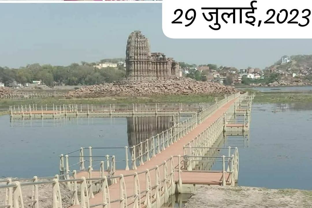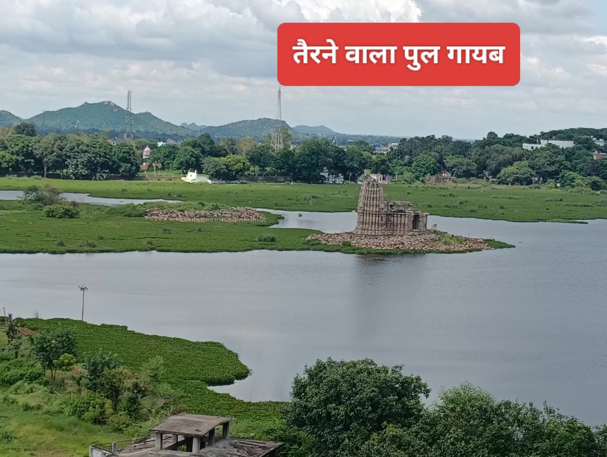 वीरभूमि महोबा मे चन्देलों के बड़े तालाब जलसंरक्षण की बेमिसाल नजीर है। चरखारी को तालाबों के कारण मिनी कश्मीर कहतें रहें है। इस शहर का कीरत सागर तो आह्वा-उदल के पराक्रम और कजली मेला को विख्यात है। किंतु आज शहर के मदन सागर (खकरा मठ) की सूरत ही नासाज है। बतलाते चले कि 29 जुलाई 2023 की तस्वीर है जब इस मदन सागर पर प्रशासन ने एक तैरने वाला फ्लोटिंग फाइबर पुल बनवाया था। लाखों रुपया इसमें खर्च हुआ था। इस तालाब के बीचोंबीच खकरामठ शिवालय है। यहां तक तैरने वाला फ्लोटिंग पुल बना था। लेकिन पर्यावरण एनओसी न होने से यह बाधित हुआ। तालाब पर फ्लोटिंग पुल बनाते वक्त प्रशासन ने प्रदूषण नियंत्रण बोर्ड से अनुमति नही ली थी। वहीं दूसरी तस्वीर 29 जुलाई 2025 की है जब रखरखाव के अभाव मे यह फ्लोटिंग पुल बह गया। तीसरी तस्वीर 21 अगस्त 2025 की है जब करोडों का खूबसूरत पुल टूटकर बिखर गया है और खकरामठ शिवालय तक उसके निशान मौजूद नही है। चौथी तस्वीर मे सिर्फ खकरामठ दिखता है।