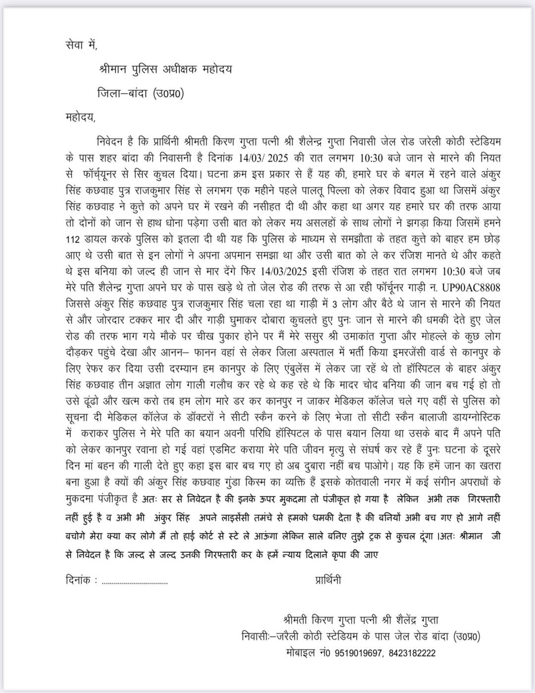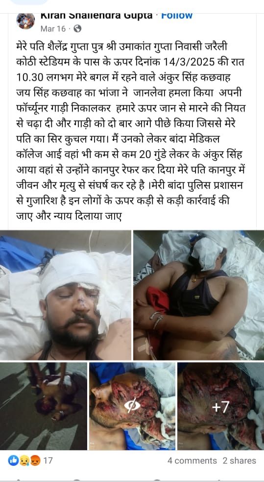 बाँदा। शहर के जेल रोड, स्वराज्य कालोनी, जरैली कोठी के पास रहवासी युवा शैलेंद्र गुप्ता पर बीती 14 मार्च की रात 10 बजे के बाद पड़ोसी अंकुर सिंह कछवाह ने जानलेवा हमला किया। जानलेवा हमले की तस्वीरों को देखकर किसी की भी रूह कांप जाएगी। अलबत्ता किस्मत का तेज शैलेंद्र गुप्ता ज़िंदा है यह बड़ी बात है। सोशल मीडिया मे जारी सपत्नीक किरण गुप्ता और शैलेंद्र ने एक वीडियो बयान जारी करके अपने और परिवार को उक्त दबंग से जीवित बचाने की गुहार लगाई है। इस खबर के साथ वह तस्वीर, फेसबुक पर वायरल वीडियो, पीड़ित का पुलिस प्रशासन को निवेदित पत्र और धर्मपत्नी किरण के द्वारा किया गया पोस्ट स्क्रीन शाट चस्पा है।