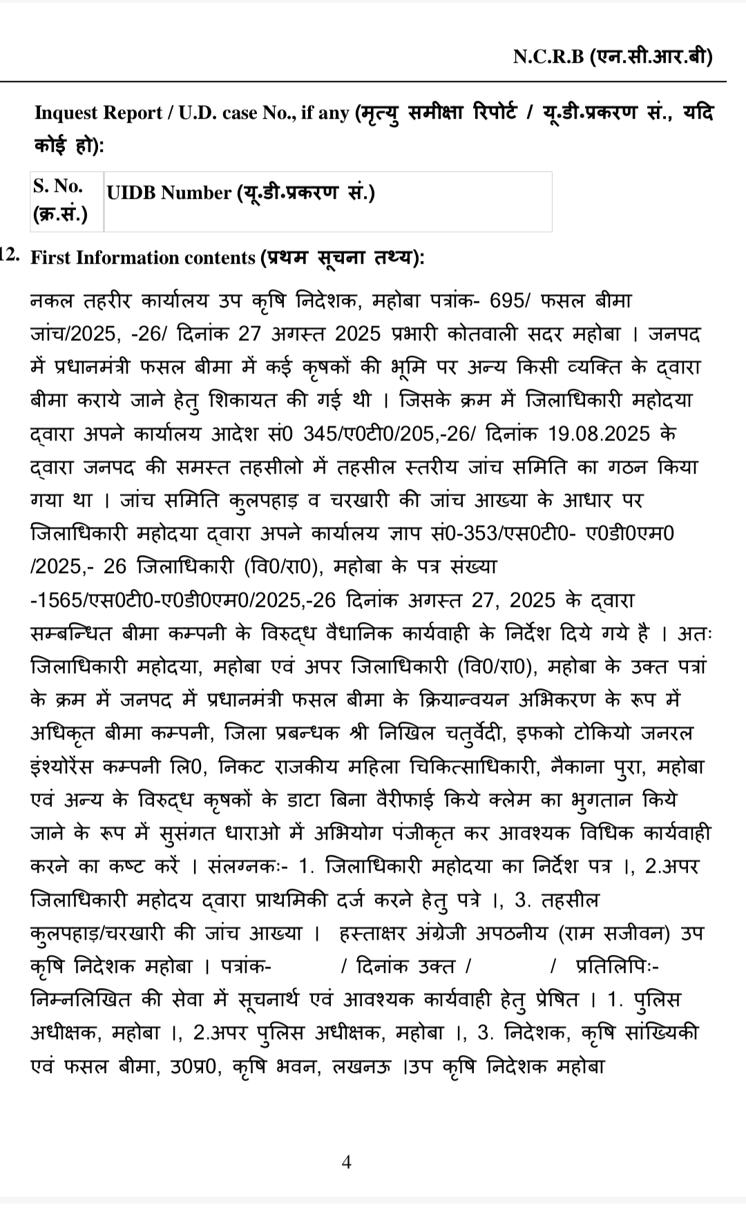 - इफको टोकियो जनरल इंश्योरेंस कंपनी लिमिटेड के बीमा कंपनी ज़िला प्रबंधक निखिल चतुर्वेदी अभी फरार है। इनके नाम मुकदमा अपराध संख्या 0387/2025 नगर कोतवाली मे बीएनएस की धारा 328(4) पर केस दर्ज है।