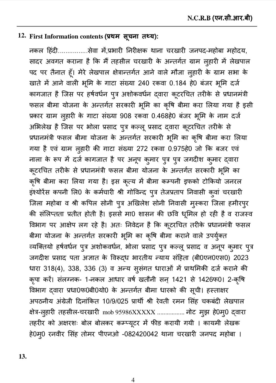 प्रधानमंत्री फसल बीमा योजना के भ्रष्टाचार को पकड़ने के लिए डीएम ने तहसील स्तर पर जांच कमेटी गठित की थी। जिलाधिकारी कार्यालय के पत्र आदेश संख्या 345/एसटी/205-26/दिनांक 19 अगस्त 2025 के क्रम मे जनपद की तहसीलों मे तहसील स्तर पर जांच समिति गठित की गई। तहसील कुलपहाड़ व चरखारी की आख्या मुताबिक कार्यालय ज्ञापन संख्या 353/एसटी-एडीएम/2025-26 जिलाधिकारी (वित्त/ राजस्व) महोबा के पत्र संख्या 1565/एसटी-एडीएम /2025-26 दिनांक 27 अगस्त कर अनुपालन मे संबंधित दोषियों पर प्रधानमंत्री फसल बीमा योजना मे भ्रस्टाचार करने एवं सरकार की छवि धूमिल करने के चलते एफआईआर दर्ज करने के आदेश हुए थे। जिसके अनुसार पहला मुकदमा फसल बीमा कंपनी इफको टोकियो जनरल इंश्योरेंस कंपनी,निकट राजकीय महिला चिकित्सालय,नैकानापुरा महोबा नगर ज़िला प्रबन्धक निखिल चतुर्वेदी के नाम मुकदमा संख्या 0387/2025 धारा 318(4) दर्ज हुआ था। लेकिन अभी तक यह फरार है। वहीं प्रधानमंत्री फसल बीमा योजना मे गबन के आरोपियों की गिरफ्तारी को पुलिस दबिश देने का दावा करती है। जबकि निखिल चतुर्वेदी को कोई पकड़ नही पाया है। काबिलेगौर बात है कि कुलपहाड़ बीट प्रभारी मलखान सिंह की मानें तो उन्होंने तहरीर देकर बताया कि वनभूमि के गाटा संख्या 157,158,160,174 पर देवकरण, अनिल कुमार, कमलेश निवासी जैतपुर पर फर्जी तरीके से अपनी ज़मीन बतलाकर फसल बीमा क्लेम के लिए करने का खुलासा किया है। अर्थात इन्होंने जंगल भूमि,पहाड़ तक डकार लिए है।