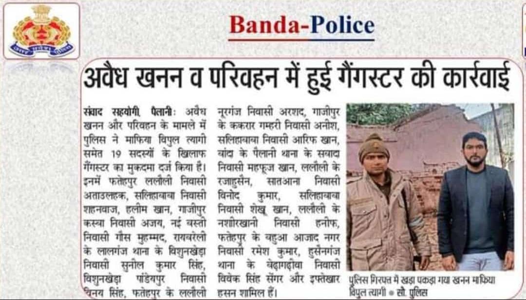 “अपराधियों एवं माफियाओं पर कड़ी कार्यवाही हेतु मुख्यमंत्री उ.प्र. योगी आदित्यनाथ की जीरो टॉलरेंस की नीति के क्रम मे बांदा पुलिस द्वारा अवैध खनन करके राज्य सरकार को राजस्व क्षति पहुँचाने वाले विपुल त्यागी गिरोह के 2 सदस्यों (पिता-पुत्र) की अपराध मे संलिप्त रहकर अर्जित की गई 36.75 लाख रुपये की सम्पत्ति को किया गया कुर्क । उल्लेखनीय है कि प्रकरण मे पूर्व मे 3 अन्य अभियुक्तों की 85.71 लाख रुपये की संपत्ति को कुर्क किया गया था।”