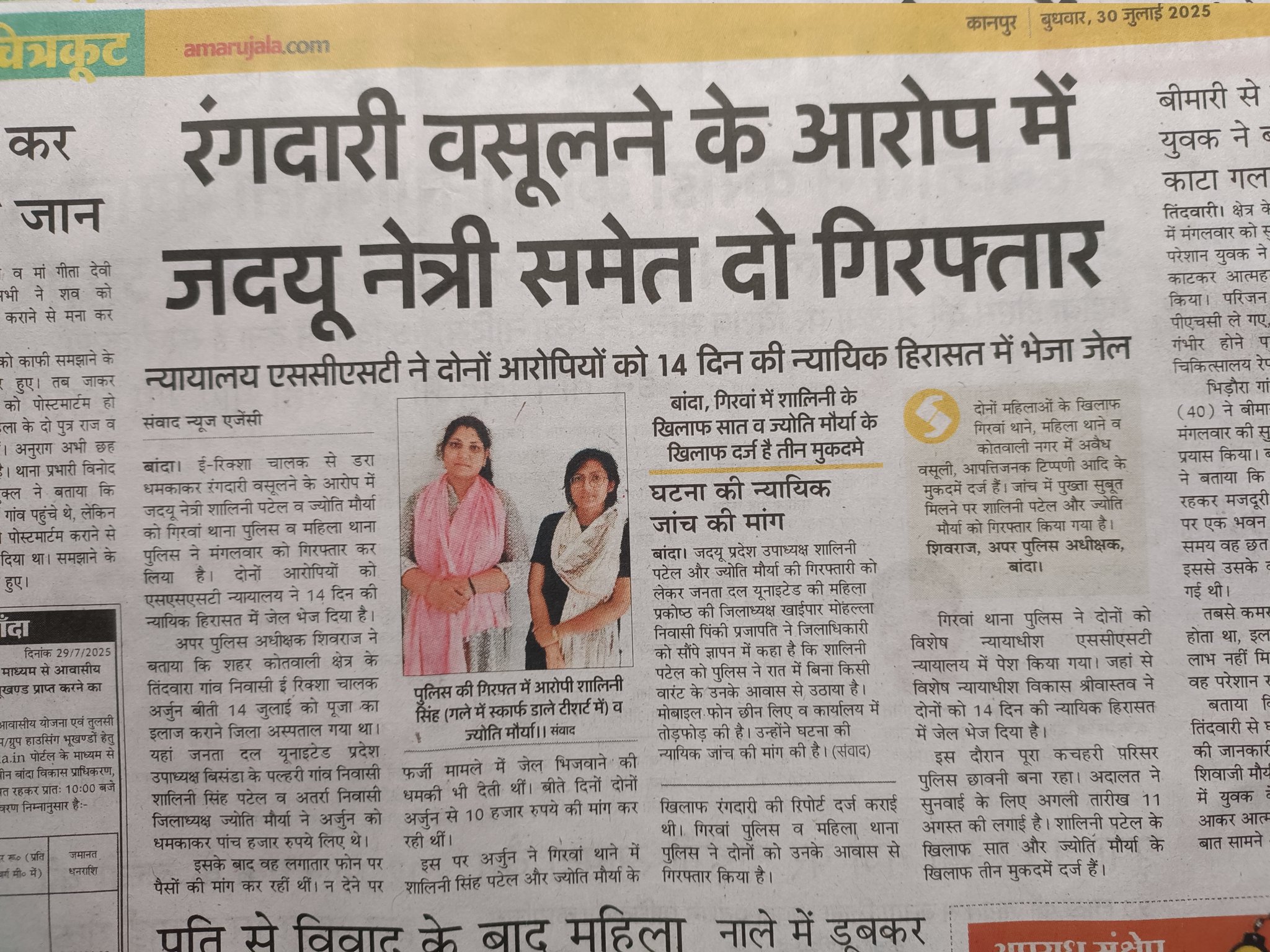 - ग्राम तिंदवारा के दलित अर्जुन की पत्नी रूपा से पहले 50 हजार फिर 10 लाख रुपया रंगदारी मांगने का आरोप जदयू नेत्री शालनी पटेल एवं ज्योति मौर्या पर लगा है।