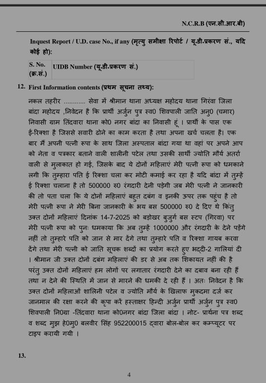 प्रार्थी के पास एक ई-रिक्शा है। जिससे सवारी ढोने का काम करता है और अपना खर्च चलाता है। एक बार मै अपनी पत्नी रूपा के साथ ज़िला अस्पताल गया था। वहां अपने को नेता व पत्रकार बतलाने वाली शालनी पटेल व साथी ज्योति मौर्या अतर्रा वाली से मुलाकात हो गई। जिसके बाद ये मेरी पत्नी रूपा को धमकाने लगी कि तुम्हारा आदमी ई-रिक्शा चलाकर मोटी कमाई कर रहाहै। यदि बाँदा मे तुम्हे ई-रिक्शा चलाना है तो 50,0000 रुपया रंगदारी देनी पड़ेगी। जब मेरी पत्नी रूपा ने जानकारी कि तो पता चला कि दोनों दबंग व इनकी पहुंच बहुत ऊपर तक है। तो मेरी पत्नी रूपा ने भय वश 50,0000 रुपया दे दिए। किंतु उक्त दोनों महिलाओं ने दिनांक 14-7-2025 को बड़ोखर बुजुर्ग बस स्टॉप पर (गिरवां) मे मेरी पत्नी रूपा को पुनः धमकाते हुए कहा कि अब तुम्हे 10,00000 रुपया और रंगदारी देनी पड़ेगी। नही तो तुम्हारे पति को जान से मार देंगे तथा तुम्हारे पति और रिक्शा को गायब करा देंगे। तथा मेरी पत्नी को जातिसूचक शब्दों से भद्दी-भद्दी गालियां दी। श्रीमान जी उक्त दोनों महिलाओं के डर से अब तक शिकायत नही की थी। परंतु उक्त दोनों महिलाएं लगातार हमसे रंगदारी मांगने का दबाव बना रही है। न देने की स्थिति मे जान से मारने की धमकी दे रही है।