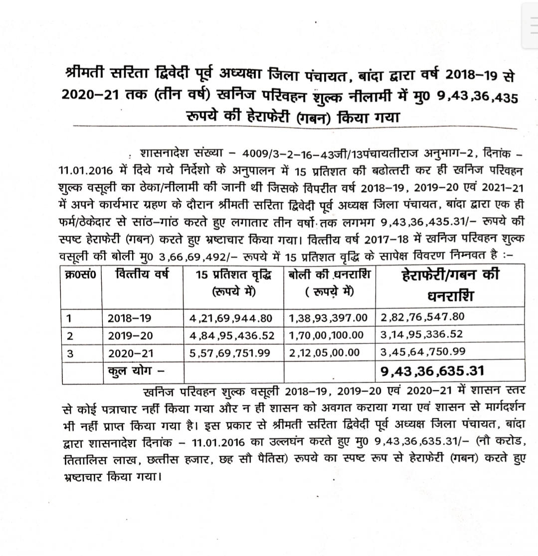 वर्तमान मंडल आयुक्त श्री अजीत कुमार द्वारा बाँदा डीएम श्रीमती जे.रीभा की बनिस्बत महोबा डीएम से तहबाजारी, 40 केवीए जनरेटर खरीद और जिला पंचायत सदस्य मीरा पटेल (सुनील पटेल गुट) के पिताजी रामौतार की फर्म को जिला पंचायत मे ठेका दिलाने की जांच प्रेषित की थी। बतलाते चले कि मीरा पटेल के पिताजी रामौतार ज़िला पंचायत बाँदा के पंजीकृत ठेकेदार है। इस पर महोबा डीएम ने पूर्व जांच रिपोर्ट पर मोहर लगाते हुए ज़िला पंचायत अध्यक्ष सुनील पटेल,तत्कालीन एमए जिनका ट्रांसफर हो चुका है। परामर्श दाता पंचानन वर्मा व एक अन्य कार्मिक को दोषी ठहराया है। मंडल आयुक्त ने डीएम से जांच इसलिए करवाई क्योंकि ज़िला पंचायत अध्यक्ष के स्तर के वित्तीय गबन की जांच जिलाधिकारी लेबल का अधिकारी ही कर सकता है। इसके बाद आख्या शासन को प्रेषण होती है। पहले सीडीओ स्तर की कमेटी ने जांच की थी जो सुनील पटेल के कद अनुसार नियम संगत नही थी। महोबा डीएम काजल भारद्वाज ने 40 केवीए जनरेटर जो 18.90 लाख मे खरीद हुई वह अमूमन 9-10 लाख का आता है। जबकि बाजार ठीकठाक खंगालने पर यह साढ़े 7 लाख का मिल जाता है। इसका बिल भुगतान 15 अक्तूबर 2025 को लगाया गया जो कि 25 अक्टूबर को पेमेंट हुआ, बाकायदा चेक भुगतान हुआ। लेकिन शिकायत हुई तो भुगतान मे रोक लगी थी। उधर शासन के विशेष सचिव राजेश कुमार त्यागी ने जिला पंचायत अध्यक्ष सुनील पटेल से जांच आख्या पर स्पष्टीकरण मांगा है। उत्तर न मिलने पर एकतरफा कार्यवाही की चेतावनी है।