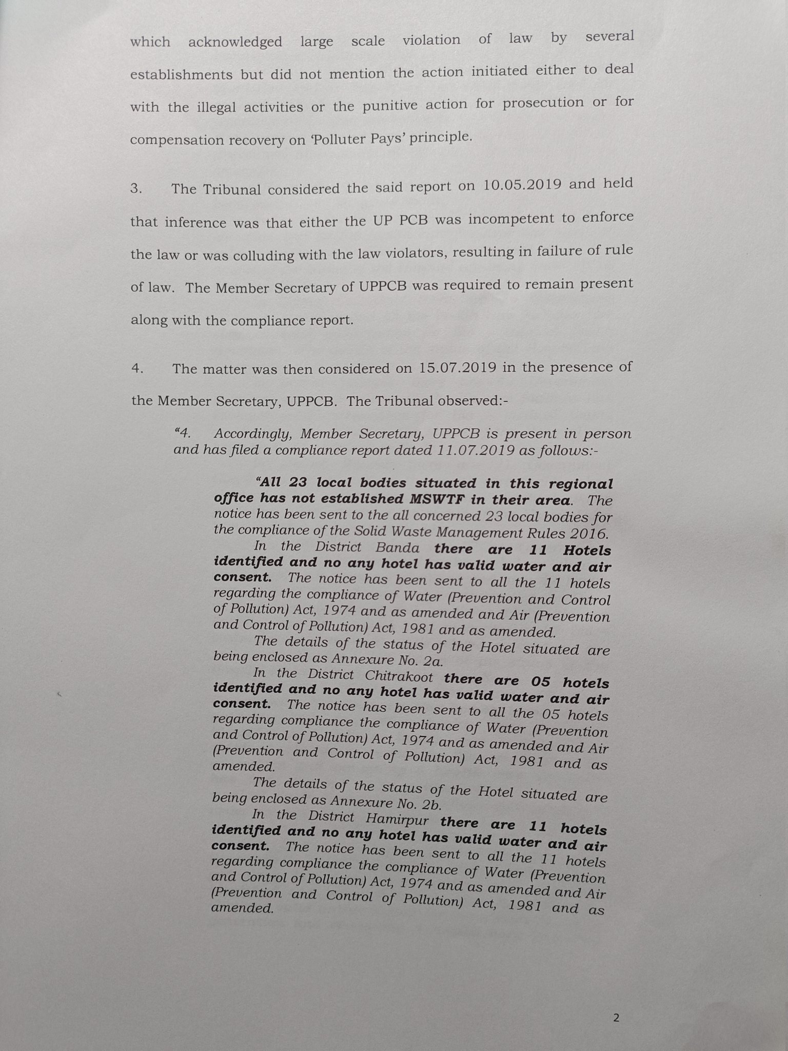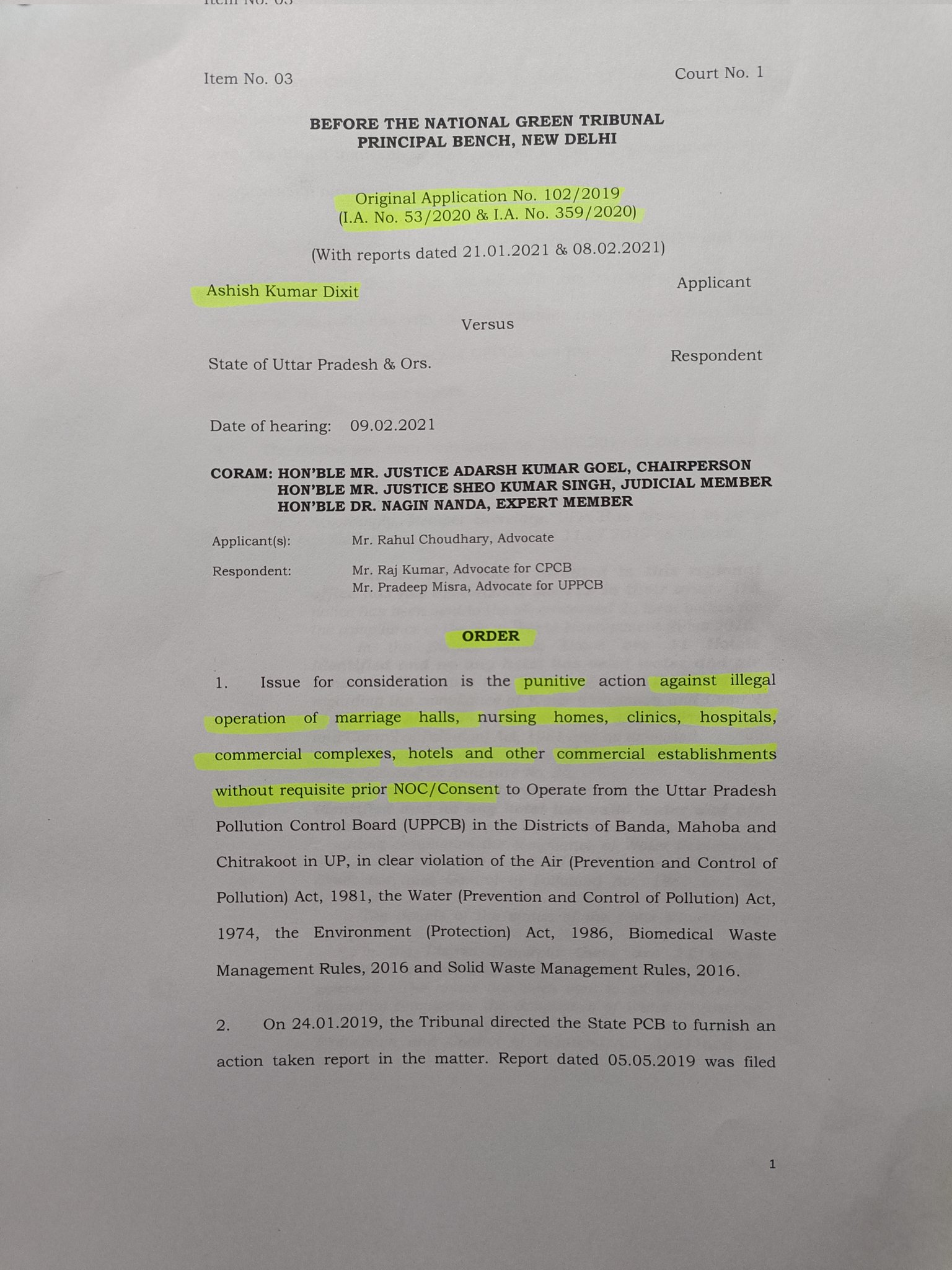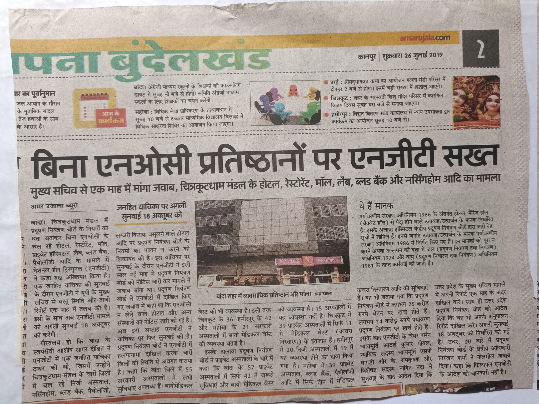 चित्रकूट मंडल के सभी जिलों सहित बाँदा मे वर्ष संचालित कामर्शियल भवन /मैरिज हाउस/निजी नर्सिंग होम/अन्य कारोबार जिनकी एनओसी पीसीबी जारी करता है। और जो भूगर्भीय जल दोहन करते, वायुप्रदूषण कर रहें है को दायरे मे लेकर पर्यावरण संरक्षण अधिनियम 1936 व अधिनियम 1981 (वायु प्रदूषण), जल प्रदूषण एक्ट 1974 व 1986 के अंतर्गत होटल,मैरिज हाल (बैंक्वेट हाल),माल से पैदा होने वाले उत्प्रवाह, कार्बन उत्सर्जन के मानक निर्धारित किये थे। इसके अतिरिक्त पीसीबी की रेड सूची मे शामिल नर्सिंग होम/सरकारी अस्पताल भी इसके परिधि मे है। जिन्हें बायोमेडिकल वेस्ट प्रबंधन नियम 2016 का अनुपालन करना है। बावजूद इसके बीडीए और क्षेत्रीय पीसीबी (प्रदूषण नियंत्रण बोर्ड कार्यालय इंद्रा नगर,बाँदा) की मिलीभगत से शहर की रिहायशी बेशकीमती ज़मीनों को, कामर्शियल बिल्डिंग मल्टीप्लेक्स भवनों के बेसमेंट पर वी-मार्ट / माल या बाहरी सार्वजनिक पार्किंग को भूमाफिया भूखण्ड बनाकर बेचने मे लगें है। यह न सिर्फ एनजीटी के आदेशों की अवमानना है। बल्कि डीएम की अध्यक्षता मे गठित ओवर साइट कमेटी / भूगर्भीय जल संसाधनों के दोहन को बनी निगरानी समिति की भी अनदेखी है। जिसमें पूरा सिस्टम संलिप्त दिखाई देता है। मुख्यमंत्री योगी आदित्यनाथ जी से इस पर त्वरित कार्यवाही करके शहरी भूमाफियाओं पर कड़ी कार्यवाही की मांग उठाई जाती है।