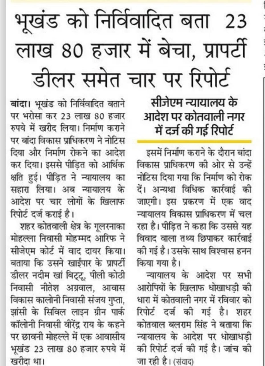 यहां उल्लेखनीय है कि मयूर मल्टीप्लेक्स व्यवसायिक बिल्डिंग की बेसमेंट मे बनी नक्शा मुताबिक पार्किंग पर वी मार्ट संचालन होता है। जिसको बीडीए पहले भी सीज कर चुका है। वहीं आज इस मयूर मल्टीप्लेक्स की बिल्डिंग बाहरी पार्किंग को कांग्रेस नेता /पूर्व नगरपालिका अध्यक्ष संजय गुप्ता रहवासी आवास-विकास बी ब्लाक, नदीम खान उर्फ बिट्टू निवासी खांईपार,पीलीकोठी निवासी नितेश अग्रवाल, झांसी के ग्रीन पार्क कालोनी निवासी वीरेंद्र कुमार राय ने धोखाधड़ी करके बेचने का कारनामा किया है। इस खेल मे बीडीए के मौजूदा अधिकारियों से सांठगांठ व मिलीभगत करने के संकेत है। जैसा कि सबको ज्ञात हो चुका है कि मयूर व्यावसायिक बिल्डिंग की बाहरी सार्वजनिक पार्किंग को आवासीय भूखंड दर्शाकर उक्त चार लोगों ने 23.80 लाख रुपये मे मोहम्मद आरिफ को बेच दिया है। जब मो.आरिफ ने उक्त मयूर मल्टीप्लेक्स काम्प्लेक्स की बाहरी सार्वजनिक पार्किंग मे निर्माण कार्य शुरू कराया तो बाँदा विकास प्राधिकरण ने इसको सीज कर दिया था। इस ज़मीनी मामलें की धोखाधड़ी से आहत मो.आरिफ ने भागदौड़ के बाद सक्षम न्यायालय बाँदा से नगर कोतवाली मे आईपीसी की धारा 420व 406 मे केस लिखाया था। किंतु मुकदमा आईओ ने एफआईआर निरस्त कर दी जिस पर हाईकोर्ट से आदेश बाद पुनः उक्त चार लोगों पर मो.आरिफ की तरफ से प्रथम सूचना रिपोर्ट दर्ज की गई है।
