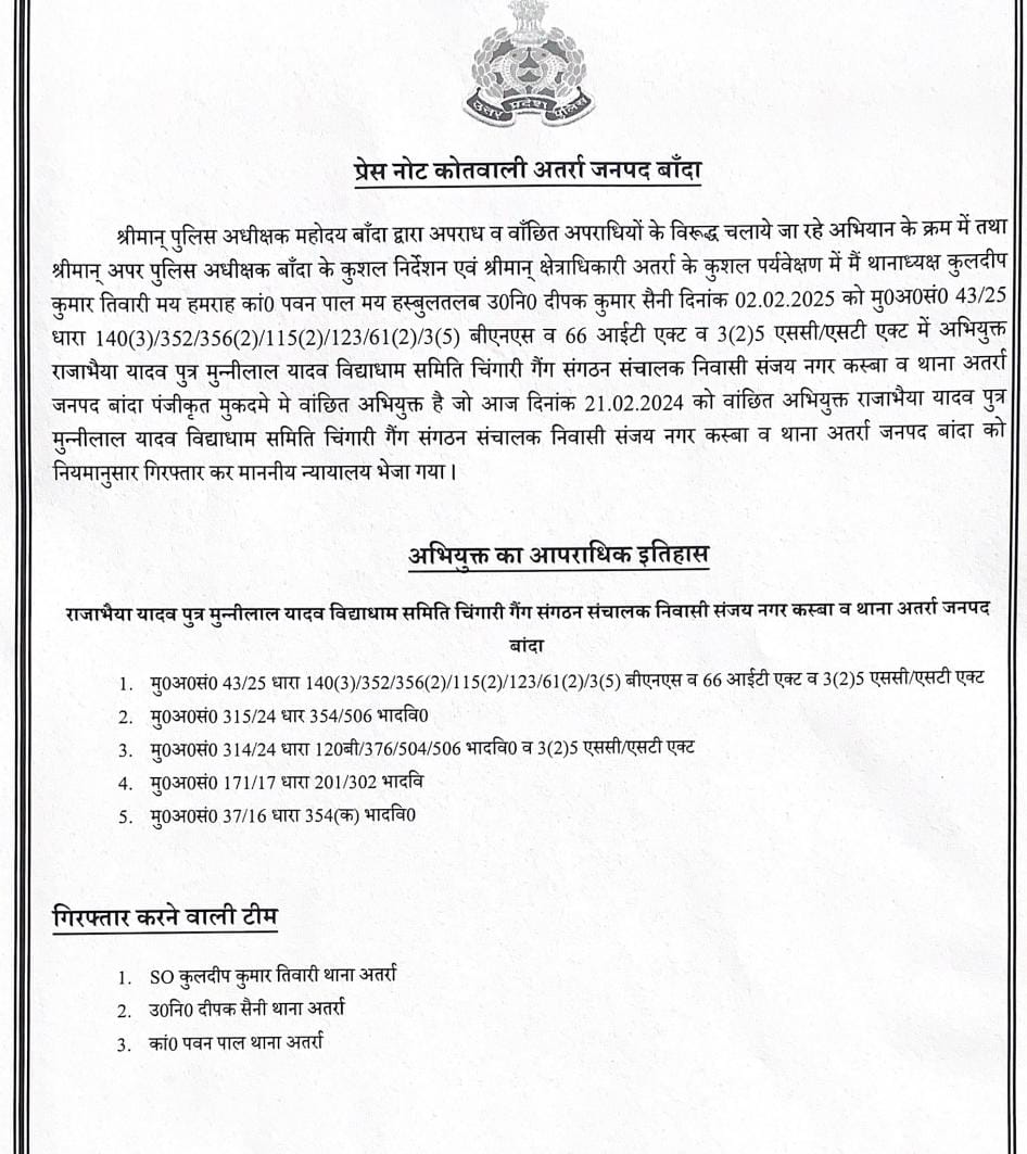 “बाँदा के अतर्रा कस्बा निवासी राजाभैया यादव को अन्तः पुलिस अधीक्षक बाँदा श्री अंकुर अग्रवाल एवं अपर पुलिस अधीक्षक श्री शिवराज सिंह के कुशल निर्देशन मे अतर्रा थाना प्रभारी श्री कुलदीप तिवारी / क्षेत्राधिकारी अतर्रा श्री प्रवीण कुमार यादव ने गिरफ्तार कर लिया है। विद्याधाम समिति और चिंगारी गैंग लीडर राजाभैया यादव को बीते 2 फरवरी 2025 को ग्राम बगदरी, मानिकपुर की दलित महिला के अपहरण / हत्या के प्रयास आदि की धाराओं मे गिरफ्तार करके माननीय न्यायालय के समक्ष पेश किया गया है। राजाभैया यादव के साथ इस मुकदमें मे 4 अन्य पुरुष अभियुक्त क्रमशः मुबीन खान पुत्र नजीर खान,शिवबहादुर, शिवकुमार गर्ग,शिराज अहमद नामजद है। वहीं इसी मुकदमे मे 17 महिलाओं को सूचना प्रौद्योगिकी एक्ट मे नामजद किया गया है।”
